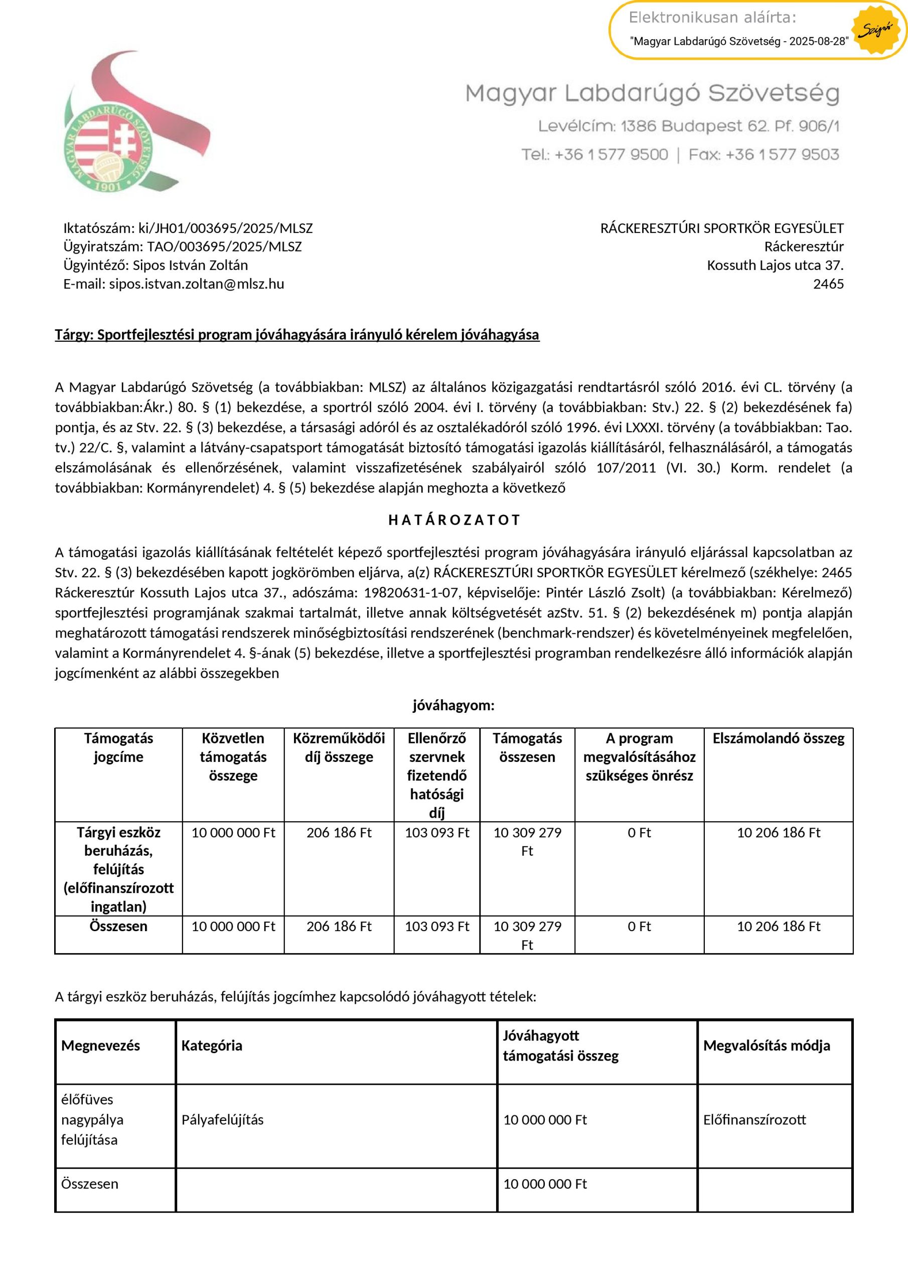 A Ráckeresztúri Sportkör Egyesület támogatási kérelmet nyújtott be (Tárgyi eszköz beruházás, felújítás jogcímen) a Magyar Labdarúgó Szövetséghez, amelyet az MLSZ elfogadott és jóváhagyott „élőfüves nagypálya felújítása” címen és 5.719.485.- Ft támogatást ítélt meg az Egyesület részére 2023.06.27-én.